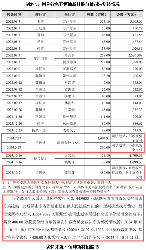 招股书显示,吕俊钦名下的2144.9万股恒坤新材股份由淄博市公安局博山分局冻结,此后经山东省淄博市博山区人民法院作出的审理判决及执行裁定被司法划转。