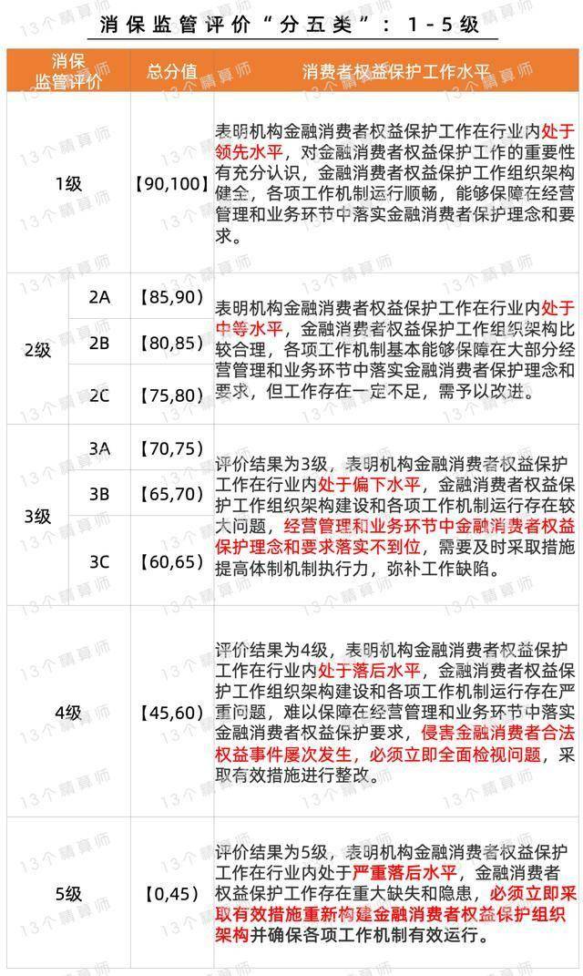 根据新规第九条,消保监管评价总分值为100分,根据最终总体得分,消保监管评价结果分为1-5级。