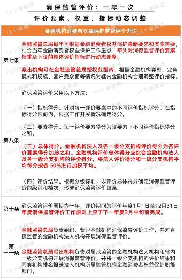 至于,消保监管评价的要素,一共7项,包括“体制机制”“纠纷化解”“金融教育”等,详见上图。