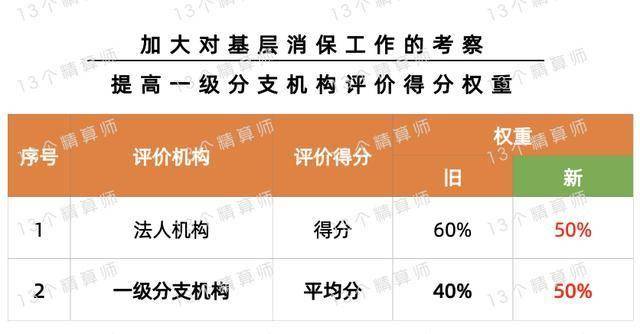 值得注意的是,在新规中,对于一级分支机构的权重从40%提升至50%,体现出对基层金融机构消保工作质效的重视。