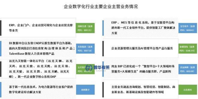 我国企业数字化行业内竞争企业主要分为三类:第一类是国央企内部的科研院所和信息化建设单位,该类企业在经过数年实践及沉淀能更好地满足客户特定数字化需求,主要包括国网信通、宝信软件、南网数字、石化盈科等;第二类是综合性软件企业,该类企业技术水平较高,管理体系相对完善,市场竞争力强,业务通常覆盖多个行业领域,如东软集团等;第三类企业聚焦企业数字化领域内特定技术或应用场景,如营销管理、资产管理平台、ERP 系统解决方案等,主要包括远光软件、用友网络、金蝶国际等。
